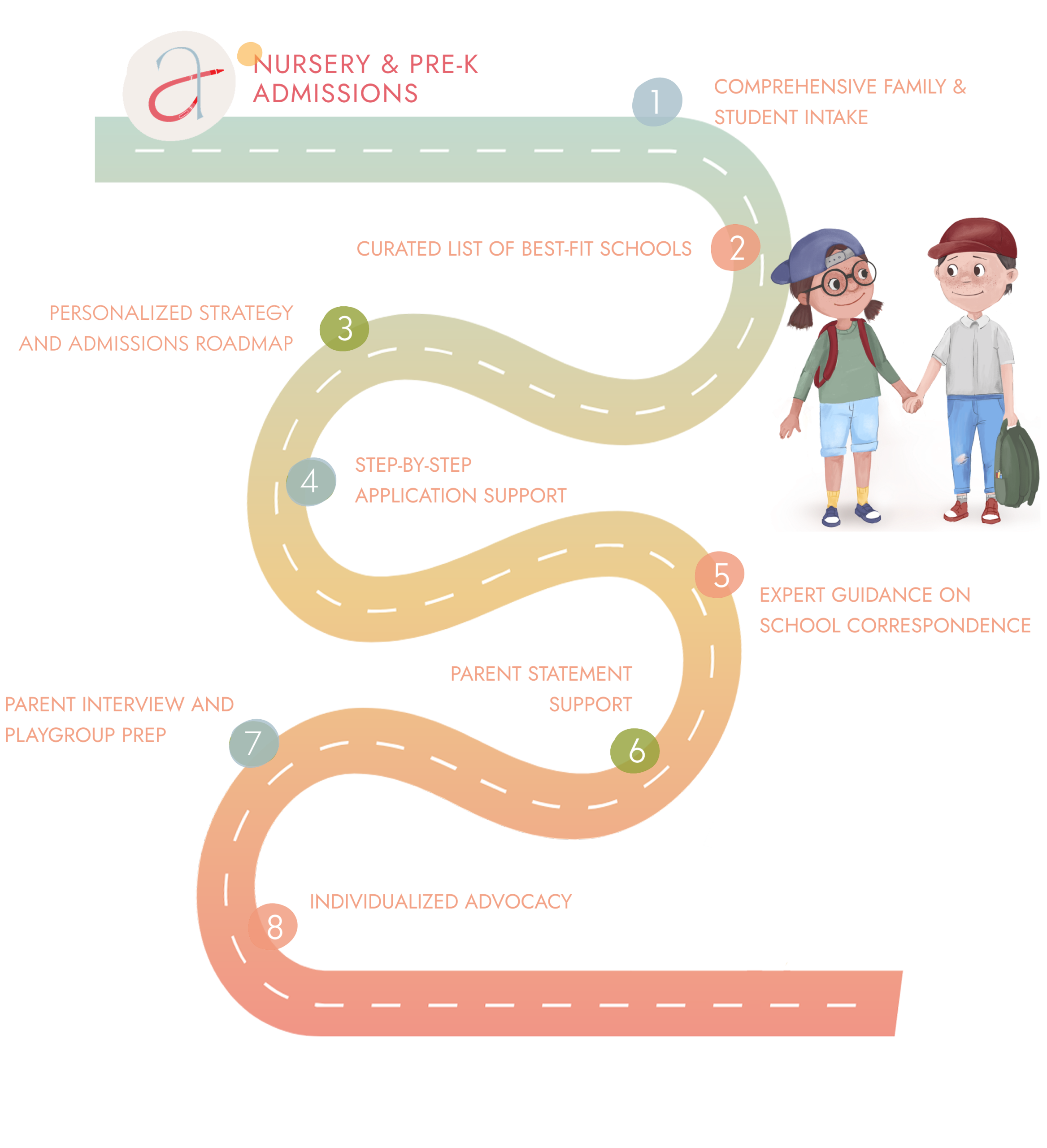 As nursery and preschool consultants, we understand that this process can be overwhelming. We act as a calming and supportive resource for families navigating their child’s first step in their educational journey. We ensure you are applying to the right schools for your child and family, assist you through the emotional side of the process, and alleviate the fatigue that can occur when applying to schools.